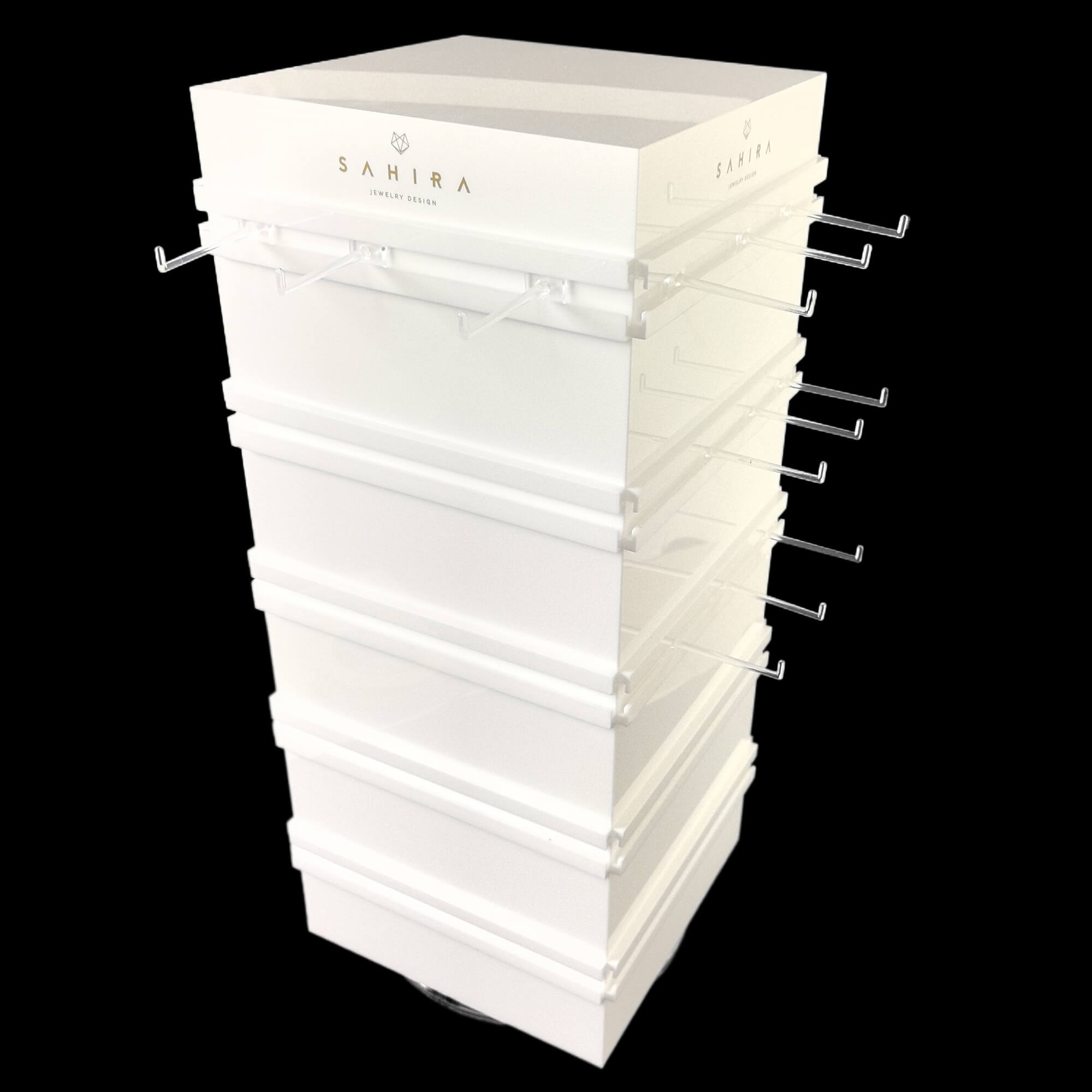 Maximize your jewelry retail space with this 4-side rotating acrylic display stand. Designed for earring and bracelet card displays. Customizable with your logo. Compact size: 8"x8"x19".